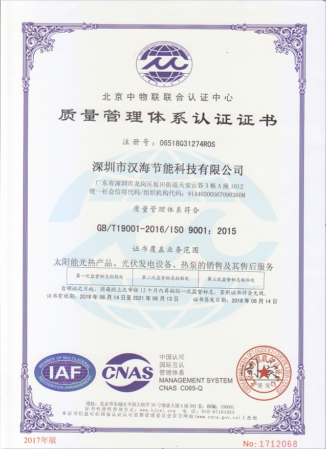 深圳市漢海節能科技有限公司成立于2011年,注冊資金6000萬元,總部設在深圳,是一家集設計、研發、施工于一體的專業化從事太陽能中央熱水工程、熱泵中央熱水工程、中央空調、光伏發電、水處理等新能源及節能環保行業的綜合服務商和工程商。在將近10年的發展歷程中,始終走在行業發展的前沿,是專業從事太陽能光熱、光伏,空氣源、太陽能熱水工程、水源熱泵,中央空調,水處理產品的設計、安裝、售后服務為一體的高新技術企業;是專業提供太陽能中央熱水工程、熱泵中央熱水工程、中央空調工程、光伏發電工程、水處理工程、太陽能熱水工程等全面解決方案的供應商和工程商,產品涵蓋太陽能集熱器、空氣源熱泵、水源熱泵、中央空調、光伏組件、太陽能熱水工程等,是新能源的倡導者和推動者。公司成立以來,始終秉承“誠信、責任、專業、高效”的服務宗旨,以市場需求為導向,以為客戶創造價值為己任的精神,不斷開拓創新,通過多年的快速發展,公司綜合實力躍居行業前列。漢海擁有一支經驗豐富、善打硬仗的專業高效團隊;擁有一批專業的高級工程師、中級工程師、二級建造師、造價工程師、電氣設計師、給排水設計師;擁有一批機電、安防、水、電等專業技術施工和售后人員,配備先進齊全,實力雄厚,技術領先。漢海以質量樹信譽、以工藝立標桿、以管理創效益、以服務得人心,工藝水平在業界獨樹一幟,成為行業模仿的典范。漢海承建的機電工程(設計、施工)涉及星級酒店、賓館、高檔辦公樓、花園別墅、住宅小區、學校、水療中心、工廠等各種類型的工程,工程項目遍布全國各地。漢海將致力于成為全球信賴的新能源綜合服務商,為客戶提供新能源的全方位解決方案。未來,漢海將依托國家政策,積極開拓粵港澳大灣區、中國特色社會主義先行示范區市場及“一帶一路”沿線國際市場,推動新能源的新輝煌。